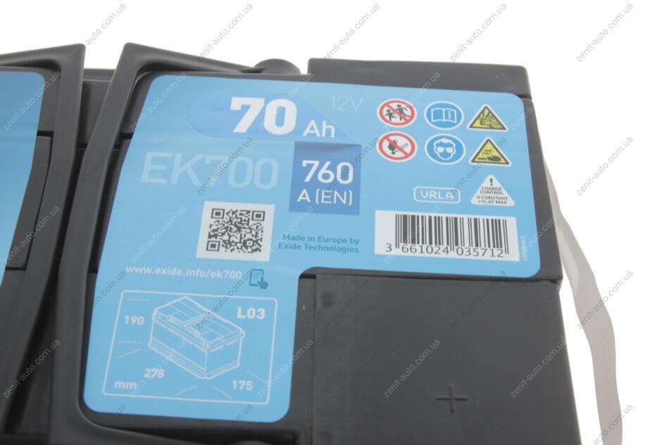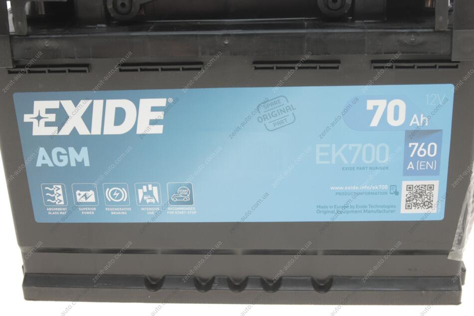 АКБ 6СТ-70 R+ (пт760) (необслуж) AGM (Start/Stop) EXIDE EK700